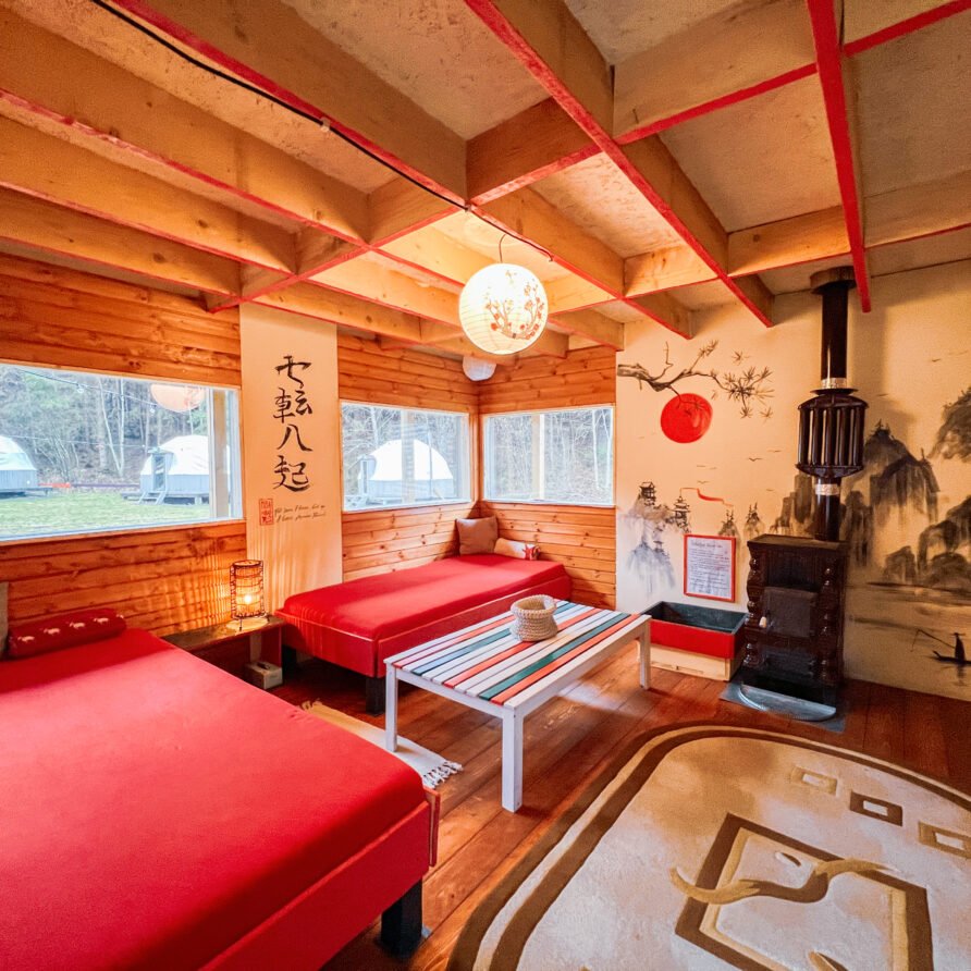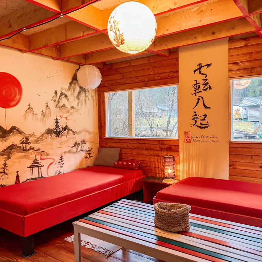 Tea House este o cabanuta de lemn cu etaj, in stil japonez. E un loc minunat, pe malul paraului Jirka, cu vedere spre Camping si spre padure, un loc unde te poti retrage sau poti chiar si lucra de la birou, avand o priveliste pe masura.